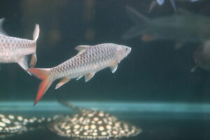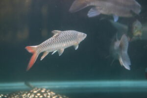 16″ The Red Tail Mahseer is a large freshwater fish in the genus Tor, part of the mahseer group of cyprinid fishes. It is most commonly identified with species like Tor tor (the “true” Mahseer) and sometimes juvenile forms of Tor putitora or regional variants that display the characteristic red or orange caudal fins and tails.